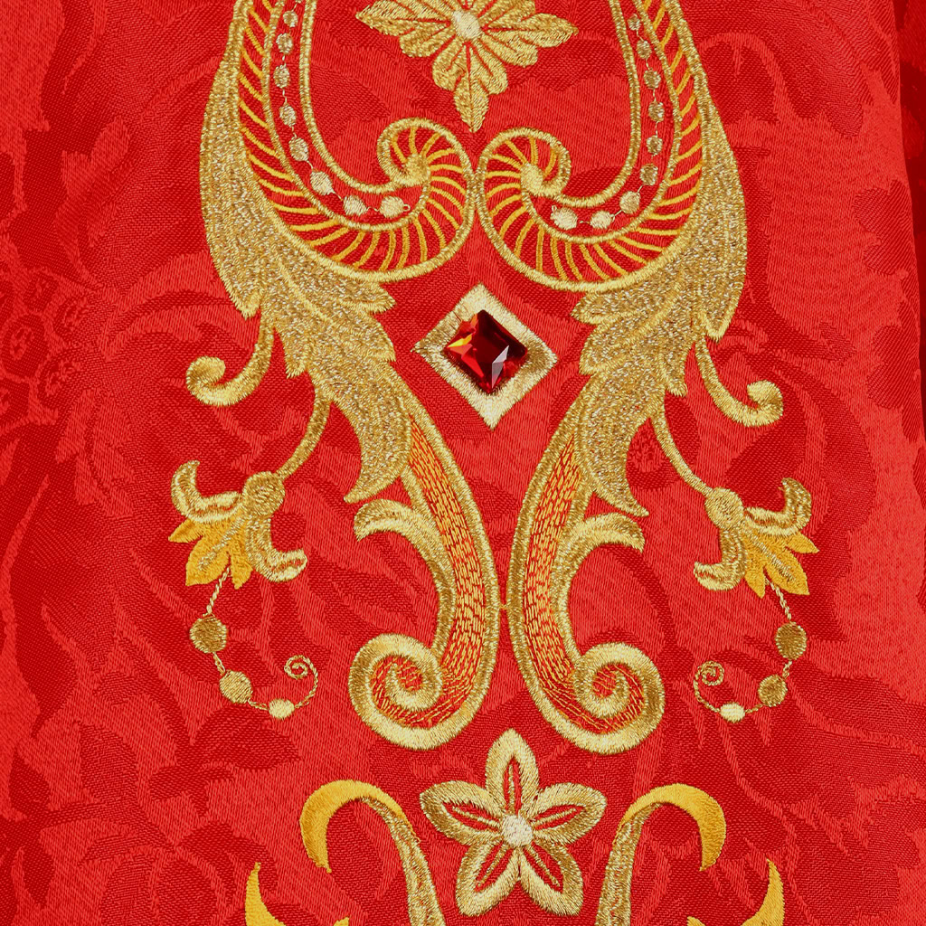 Red liturgical chasubles are worn during celebrations related to the Holy Spirit and on the feasts of martyrs. The color red symbolizes the fire of faith and the willingness to give one’s life for Christ. The high-quality gold embroidery emphasizes the sacred and solemn nature of the liturgy