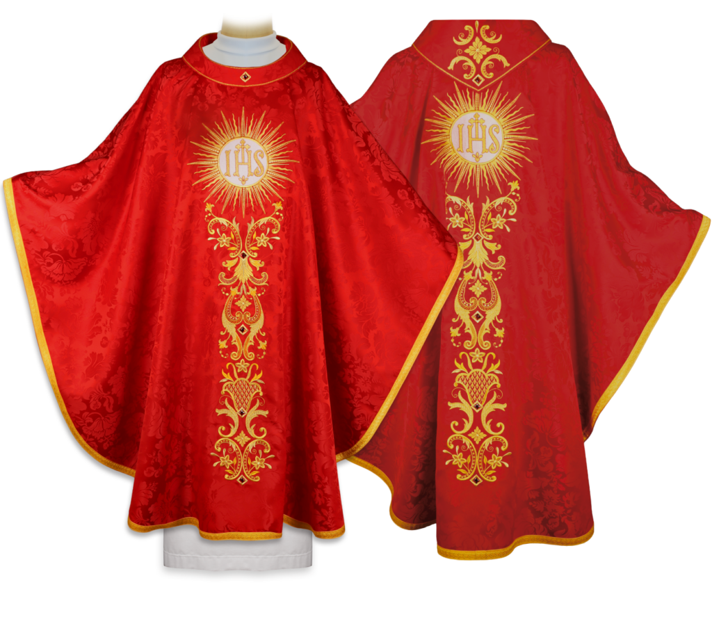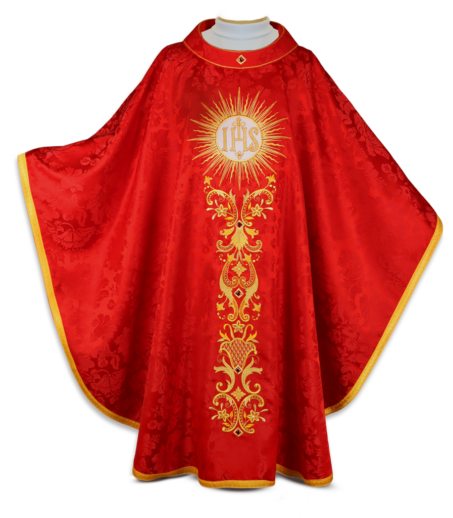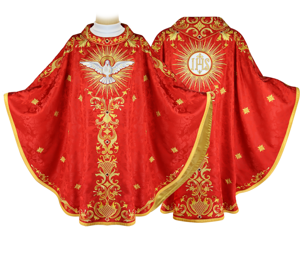 The chasuble for Pentecost should be red, symbolizing the fire of the Holy Spirit and His presence in the Church. It is best to choose a chasuble made of high-quality liturgical fabric, adorned with symbols such as a dove, rays of light, or the Christogram IHS. An embroidered chasuble emphasizes the solemn nature of the celebration and provides a dignified setting for one of the most important feasts of the liturgical year.
