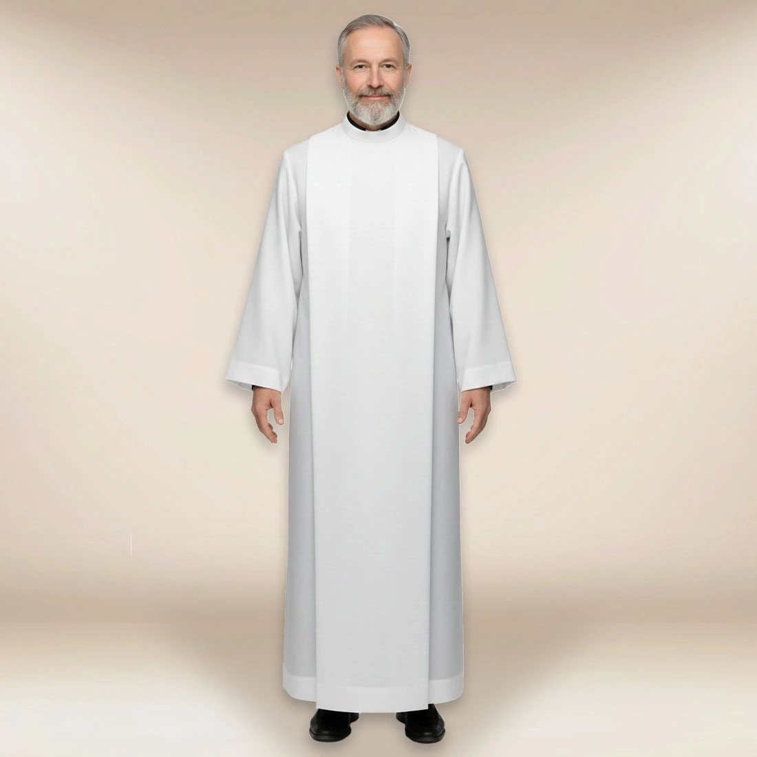 The smooth liturgical alb is a universal choice for clergy who value liturgical simplicity and elegance. The white colour of the alb symbolises purity and spiritual clarity, making it suitable for Holy Masses, services and church ceremonies. Its minimalist form, devoid of decorations, emphasises its liturgical character and harmoniously complements other elements of priestly vestments, such as the chasuble, cope and dalmatic.