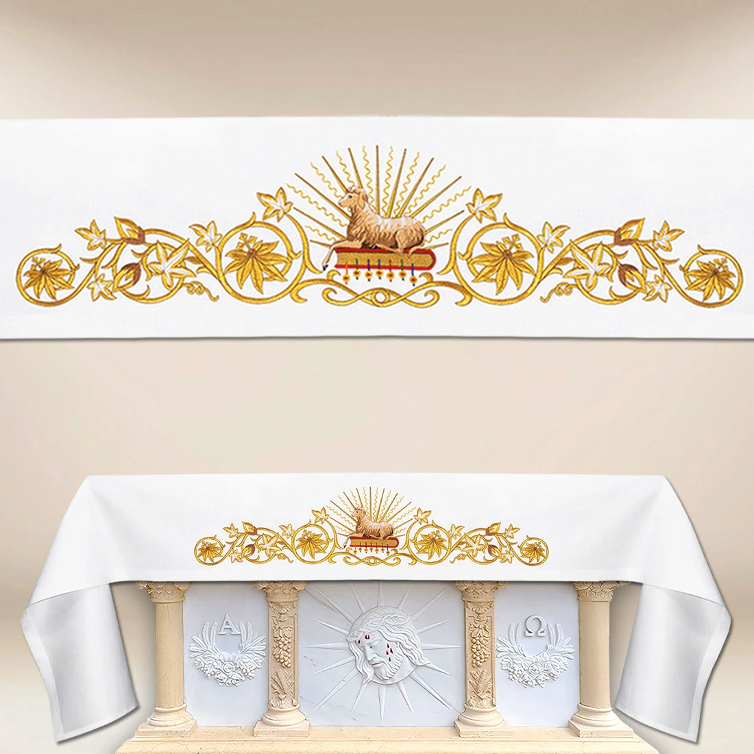 Embroidered liturgical altar cloth with frontal embroidery is a special offering for parishes that wish to emphasize the beauty of the presbytery space with elegant, symbolic decoration. The altar cloth is made from a durable, stain-resistant polyester fabric, ensuring it maintains a pristine appearance even with frequent use. The material presents itself very aesthetically, is easy to keep clean, and has an appropriate weight, allowing for an elegant drape on the altar.