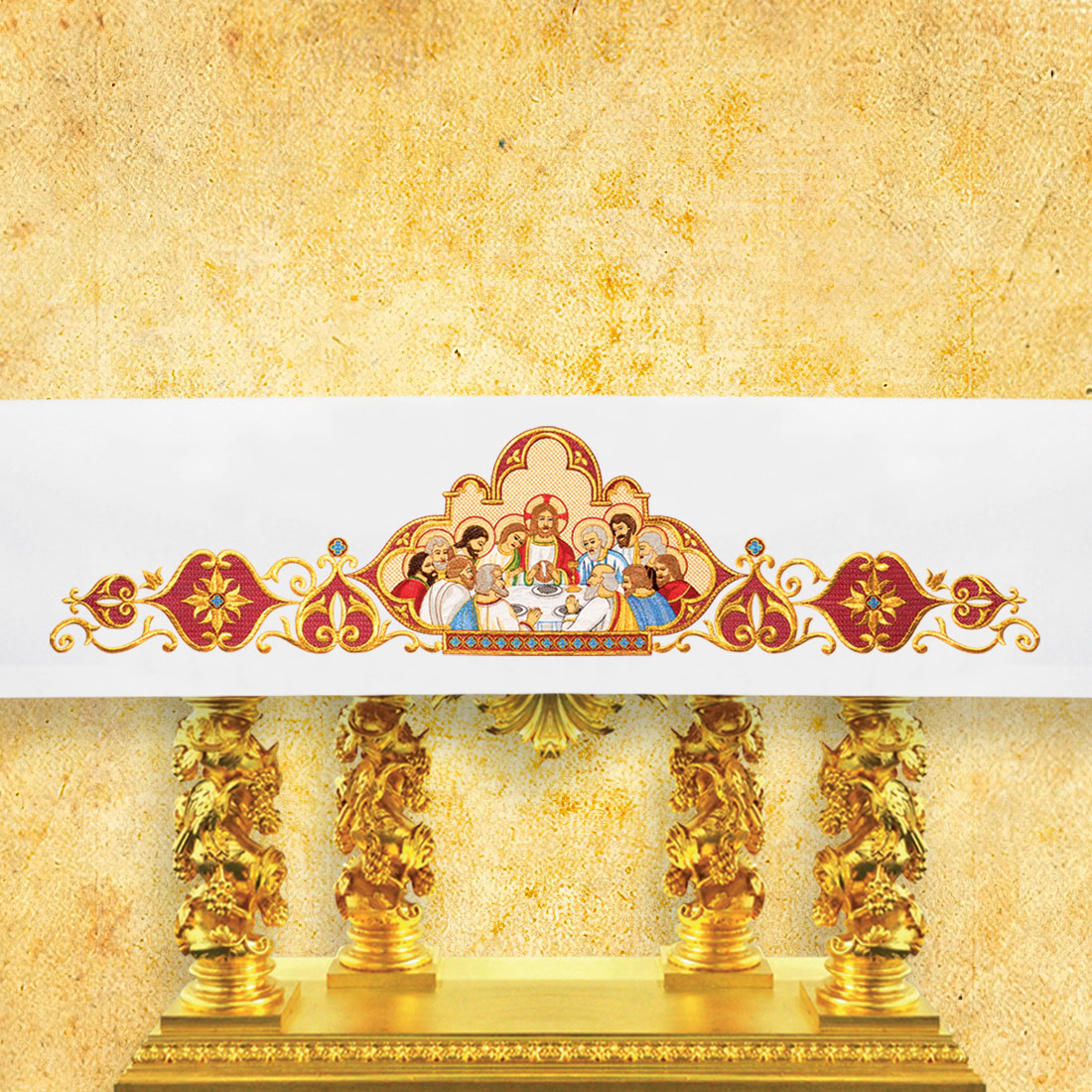 The liturgical altar cloth is made of high-quality 100% polyester fabric.The fabric is impregnated and stain-resistant, which ensures durability and ease of cleaning. The tablecloth is decorated with elegant embroidery 30 cm high and 112 cm long, which gives it a unique, sacred character. An ideal choice for churches, chapels, and solemn liturgical celebrations.