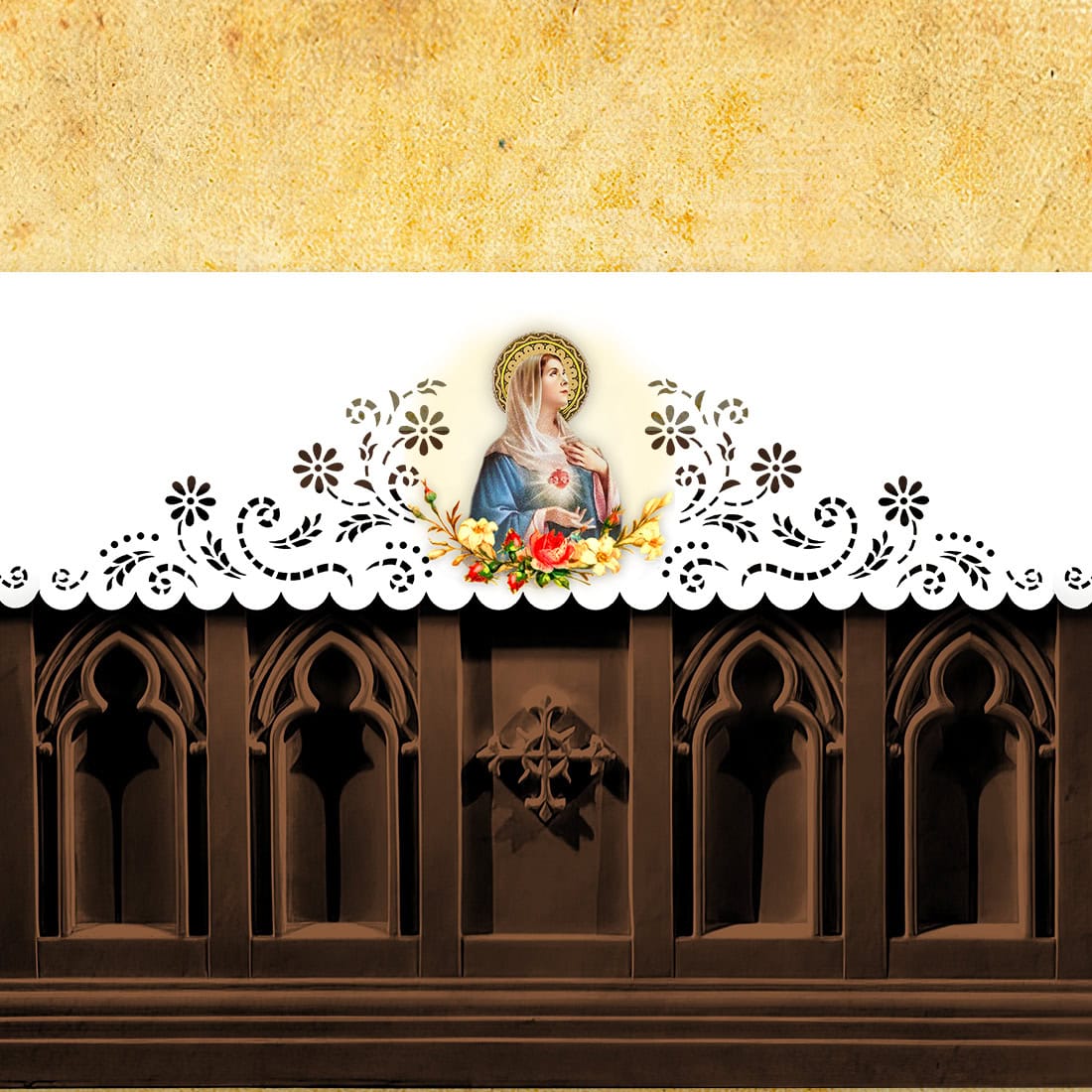 Decorative altar tablecloth, ideal for churches, chapels, shrines, and occasional altars. Made of high-quality, stain-resistant polyester fabric. The decorative band, approx. 100 cm wide, combines precise laser cuts with a durable print using the dye-sublimation technique.n