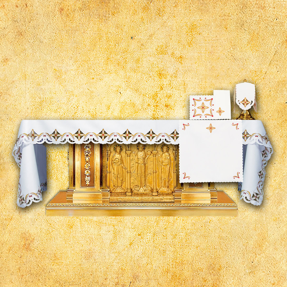 The elegant altar tablecloth decorated with “Crosses in a square – colorful” embroidery is a unique liturgical decoration. The tall 13 cm high embroidery is located on three sides of the tablecloth, emphasizing the solemn character of the Eucharist and festive celebrations. It is an excellent choice for parishes looking for durable and aesthetic church tablecloths with embroidery.
