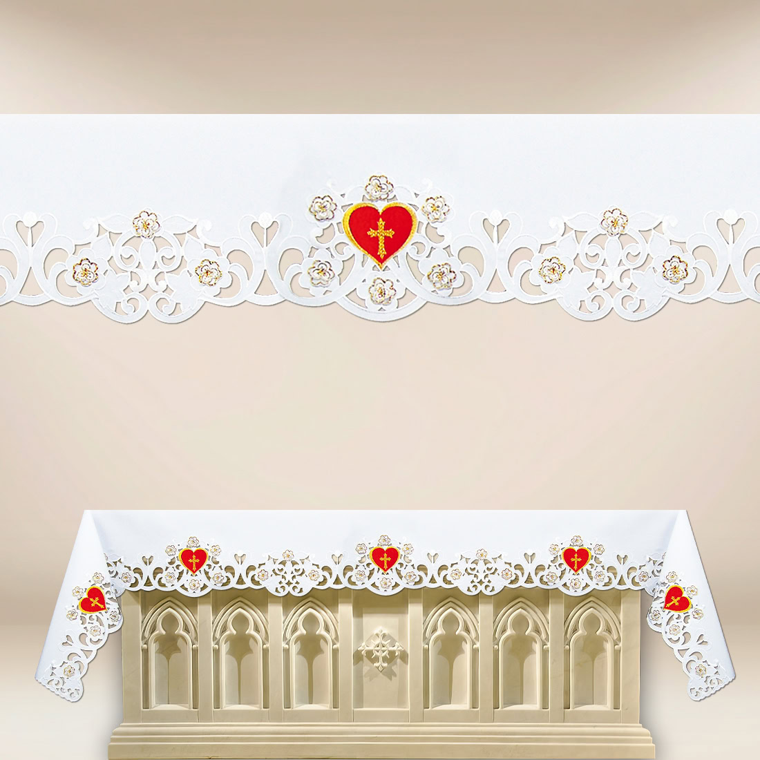 The central decorative motif is the Most Sacred Heart of Jesus, a symbol of love, mercy, and the spiritual unity of Christ with the faithful. This image has inspired the Church for centuries to prayer, trust, and readiness for service. Its placement on the tablecloth emphasizes the Eucharistic dimension of the liturgy and imparts a solemn, deeply prayerful character to the celebration. The embroidery is vivid, precise, and crafted to maintain the appropriate liturgical aesthetics.