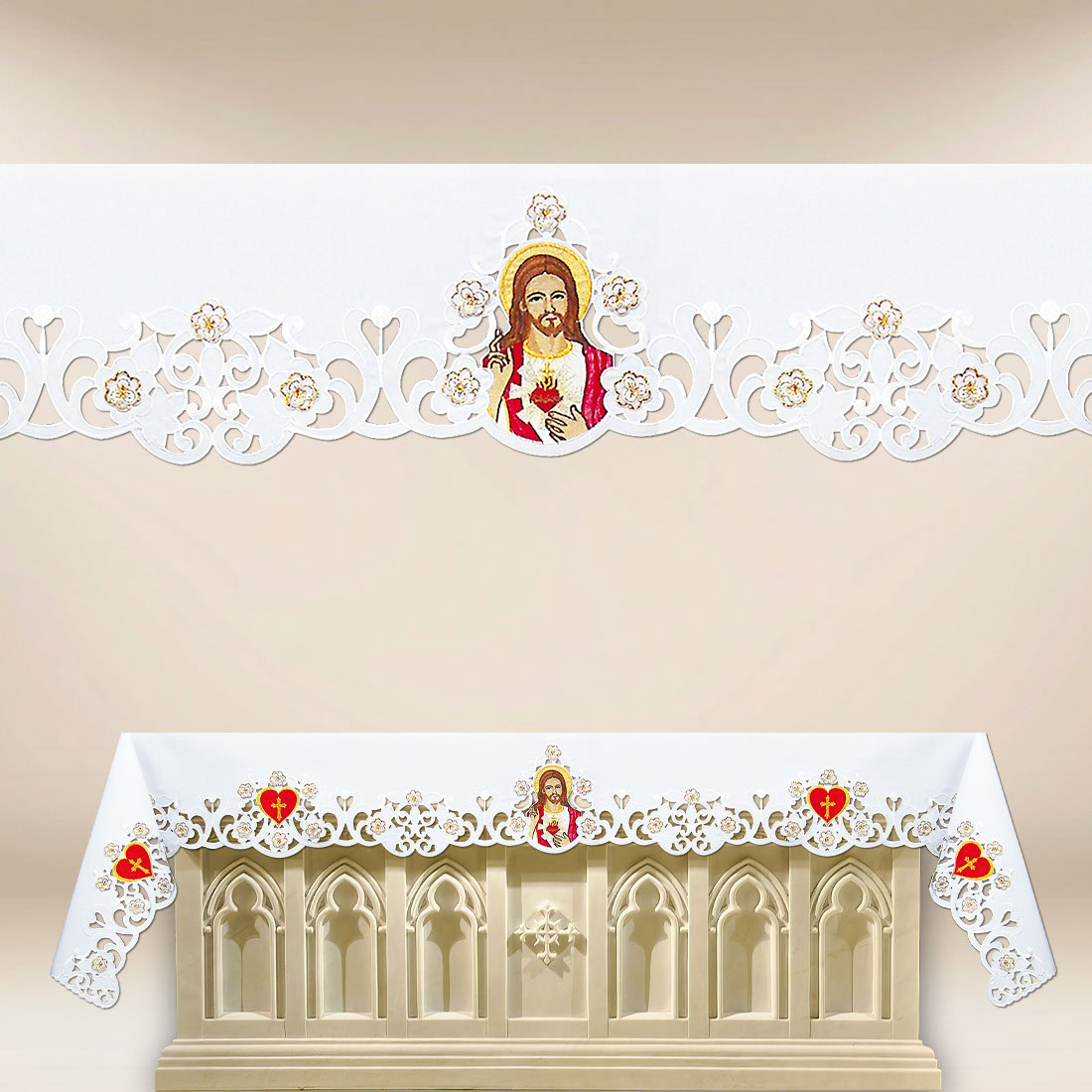 Embroidered Liturgical Cloth “Sacred Heart of Jesus” is an elegant and durable altar covering that combines sacred aesthetics with practical functionality. Crafted from stain-resistant polyester fabric, it is easy to maintain and retains its excellent appearance throughout many liturgical seasons. With an embroidery height of 23 cm, the image is vivid and appropriately emphasizes the central place of the altar. Available in lengths up to 520 cm, it is perfectly suited for both larger churches and chapels.