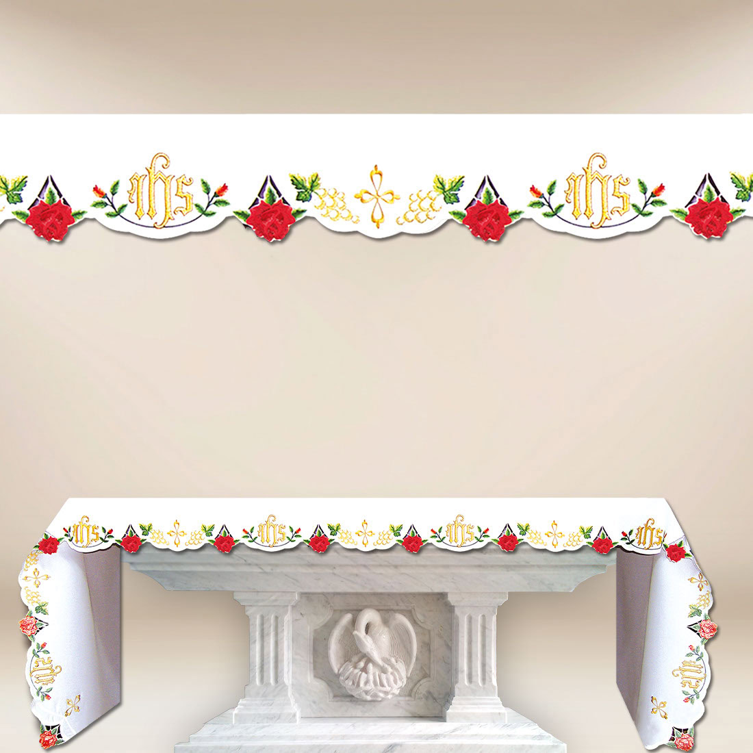 The presented altar cloth embroidered with roses is a proposal for parishes seeking elegant, durable, and symbolic altar textiles. Made from high-quality 100% polyester, it maintains its aesthetic appearance even with frequent use. The material is stain-resistant, does not fade, and remains smooth and representative for a long time. This is a particularly important feature for cloths intended for daily liturgical service.