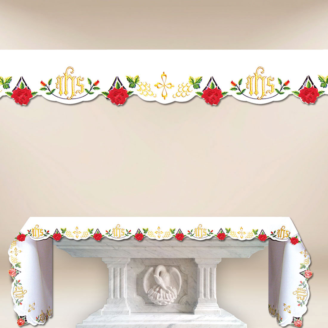 This is an excellent proposal for parishes seeking textiles that combine aesthetics, liturgical symbolism, and practical durability. The high quality of the fabric, precise embroidery, and classic style ensure that the embroidered altar cloth with roses emphasizes the solemn character of every celebration while maintaining functionality for everyday use. This model exemplifies sacred art, where tradition and modernity create a harmonious whole.