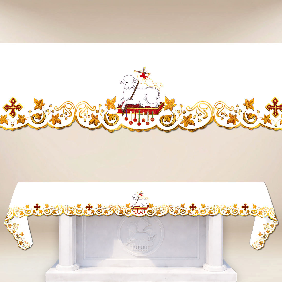 The altar cloth with a central image of the Paschal Lamb is an expression of deep theological symbolism rooted in the tradition of the Church. The motif of the Lamb, carrying the banner of victory, clearly refers to the mystery of the Eucharist, the sacrifice and resurrection of Christ, making the tablecloth not only an element of decor, but also a carrier of liturgical content.