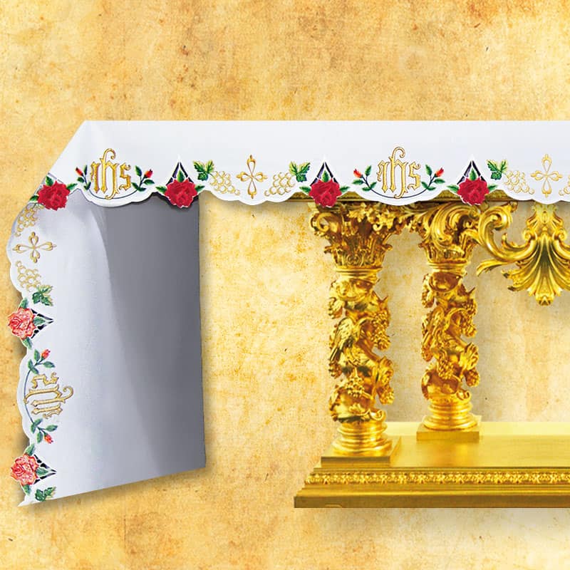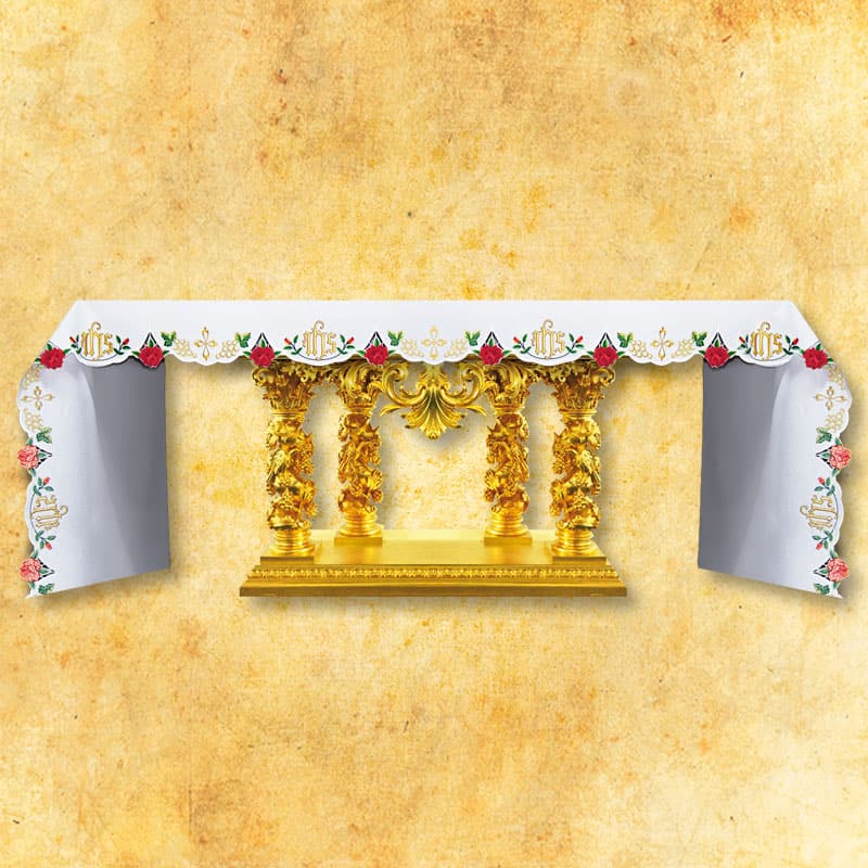 Decorative 15 cm high embroidery runs along the entire length of the tablecloth, giving it a unique elegance and emphasizing the solemn nature of the celebration.<br data-start="890" data-end="893" The rose motif symbolizes purity, beauty, and spiritual love, perfectly complementing the altar decor during holidays, celebrations, and wedding Masses.The model can be made to any size, so that the tablecloth fits perfectly on any altar.