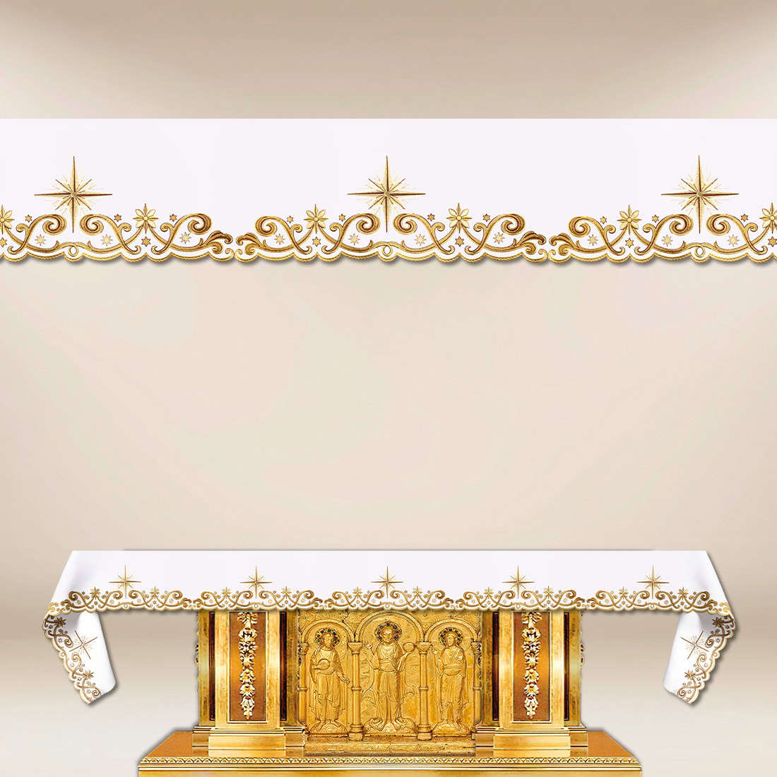 The decorative embroidery of the tablecloth adds lightness and elegance to the composition. The precise finish makes the fabric look beautiful in both large churches and smaller chapels. The tablecloth retains its proportions, allowing it to be laid evenly on the mensa, emphasising the solemn character of the altar.