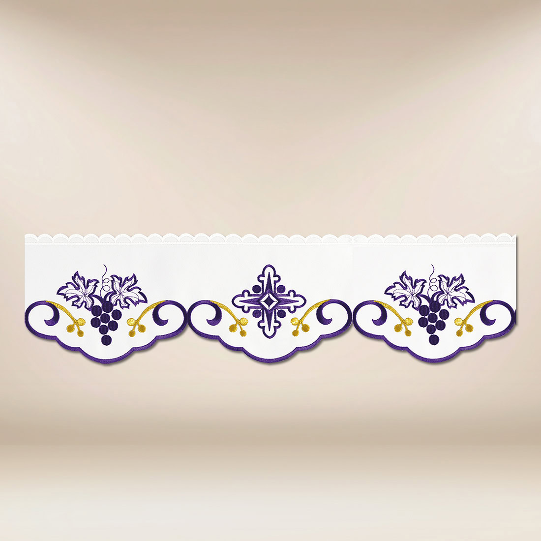 Embroidered lace from the “Paschal” setFabric: stain-resistant, 100% polyester Color: white with purple and gold embroidery Width: 14 cm Washing: machine washable at 30 degrees C, color-safe detergent recommended, no fabric softener.