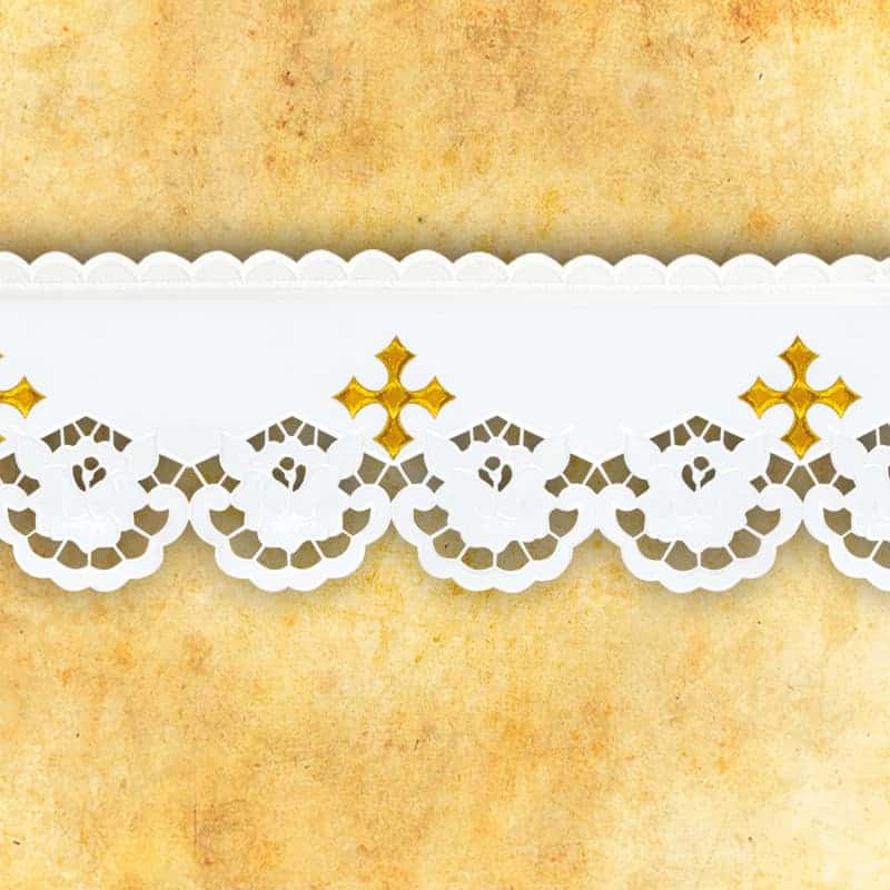 Another example of a unique product is the embroidered lace from the Affilato set. The modern pattern of the richly decorated lace is an excellent choice for sacred decorations. The Affilato embroidered liturgical lace forms an integral whole with the other items in the set. Embroidery height: 17 cm.