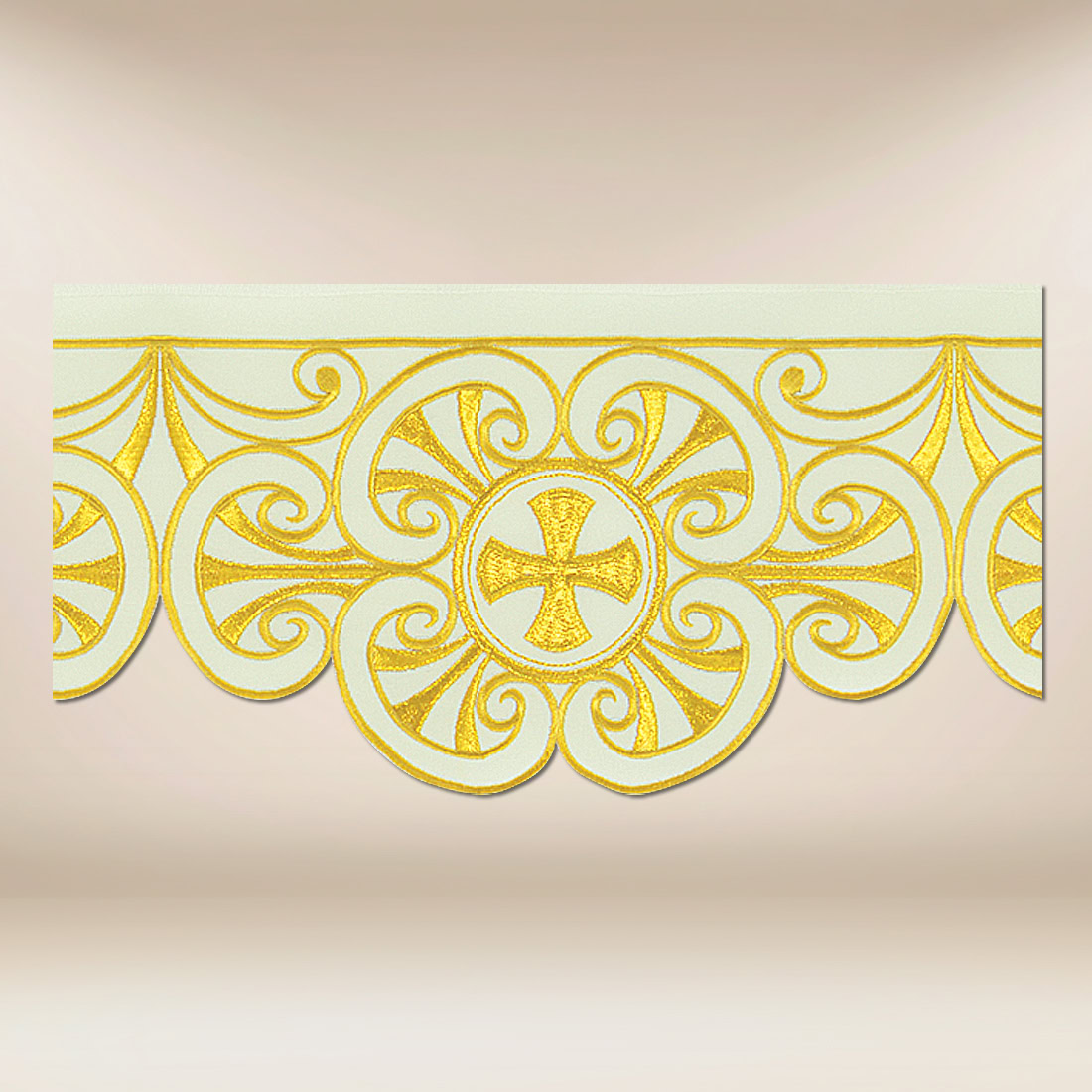 Embroidered lace in ecru, 590 cm. The central motif of the cross, surrounded by an intricate embroidery pattern, imparts to the lace a character of decorative symbolic significance, while maintaining appropriate harmony and liturgical restraint.