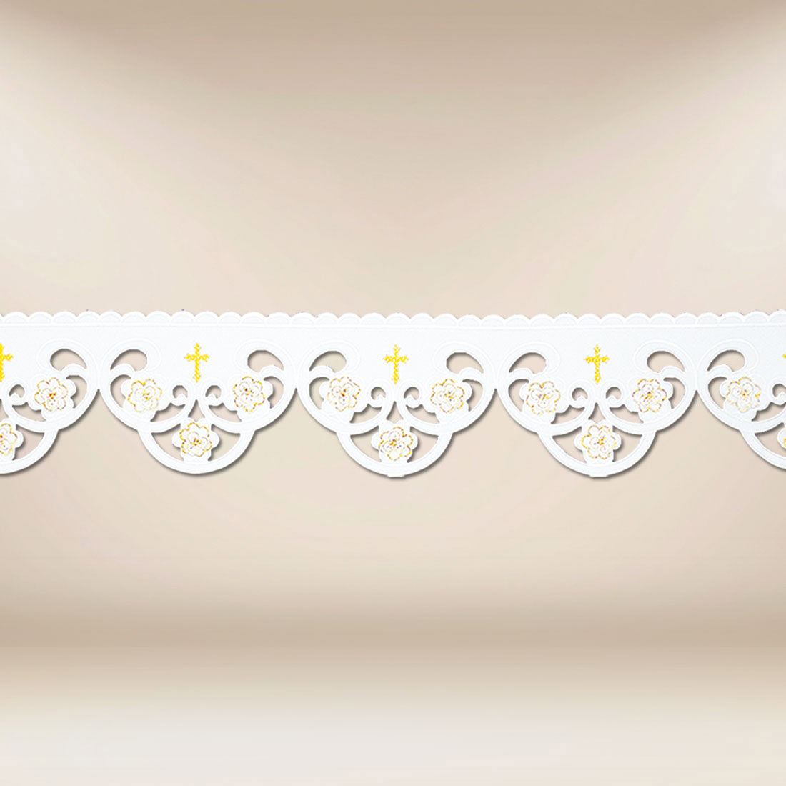 The height of the embroidery is 15 cm, giving the lace appropriate proportions that allow for a vivid yet subtle enhancement of the altar cloth. The openwork cutouts add lightness to the overall design, making the decorative band appear exceptionally harmonious. It is a beautiful liturgical accent for both solemn Masses and daily celebrations, where the aesthetics of the prayer space are important.