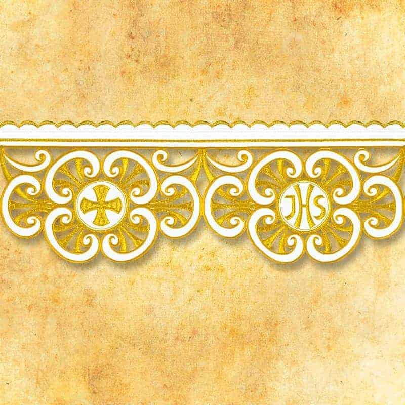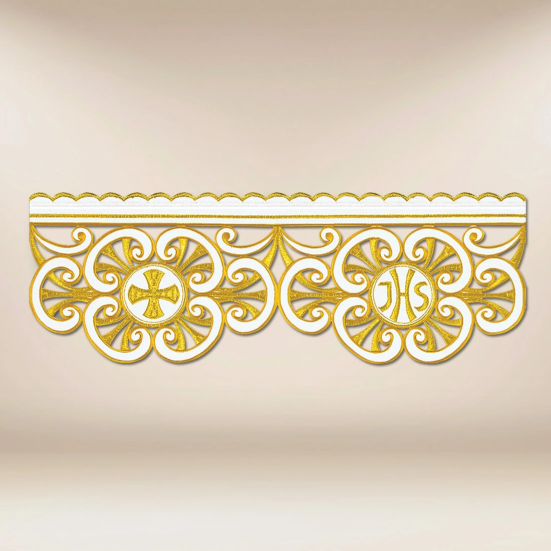 Embroidered altar lace “Santa Messa” represents a combination of elegance, liturgical symbolism, and masterful craftsmanship. The ornament, consisting of the IHS monogram and subtly arranged crosses, refers to the Eucharistic dimension of the celebration. The design has been developed to introduce order, symmetry, and liturgical harmony to the presbytery without overwhelming other elements of the decor.