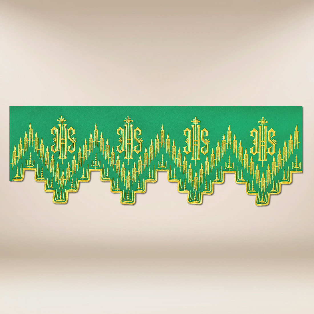 Embroidered Green Lace 590cm is an elegant and striking finish for church altar cloths, beautifully highlighting the liturgical character of the sanctuary. The monogram motif IHS, applied in a regular spatial rhythm, alludes to the Eucharistic presence of Christ. The pattern flows softly, and the ornamental lines create a composition that organizes the space and imparts a sacred dimension.