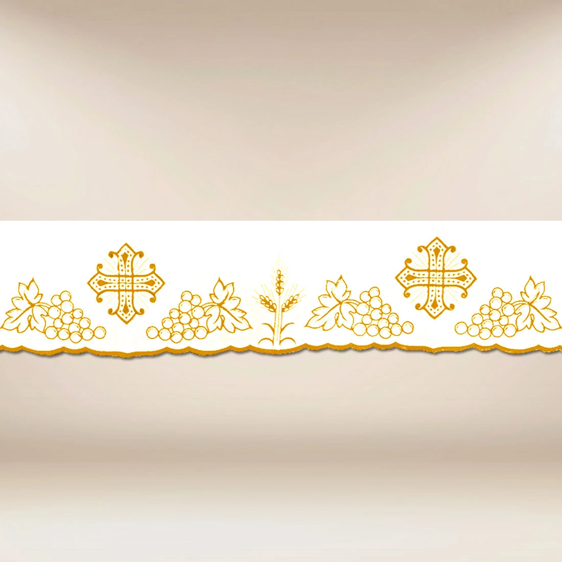 Embroidered sacred lace “Calvario” is a refined liturgical decoration, whose design draws from the symbolism of the Eucharist. The presented motifs of grapes, wheat ears, and the cross reveal the profound significance of bread and wine transformed during the Holy Mass into the Body and Blood of Christ. This embroidery composition creates a harmonious rhythm that organizes the space of the presbytery and gives it a solemn tone.