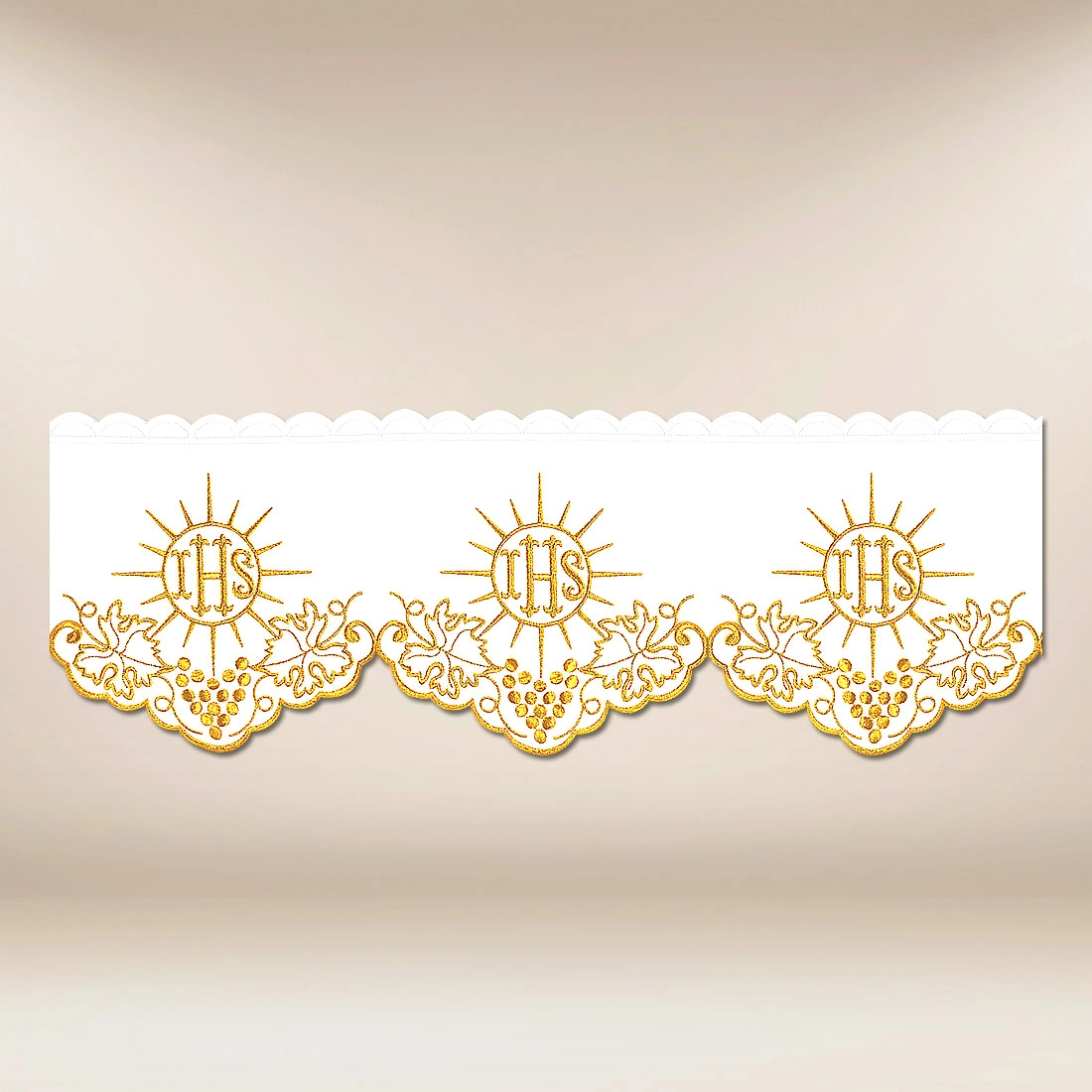 Embroidered altar lace “Cristiano” is a unique proposal for liturgical decoration that beautifully and elegantly highlights the edge of the altar cloth. Its ornament directly refers to the Eucharist — the IHS monogram, surrounded by rays, symbolizes the presence of Christ, and the motif of grapes reminds us of the biblical image of wine as a gift from God. Such symbolism makes the lace perfectly fit the sacred character of the celebration of the Holy Mass.