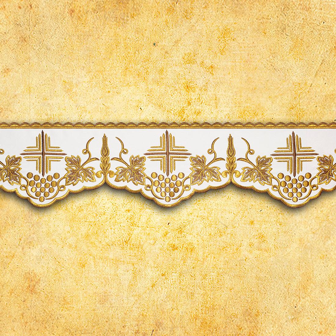 Another example of a unique product is the embroidered lace from the Gold Brown set.The modern pattern of richly decorated lace is perfect for sacred decorations.The embroidered liturgical lace Gold Brown forms an integral whole with the other items in the setEmbroidery height 17 cm