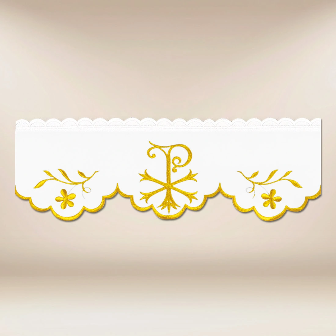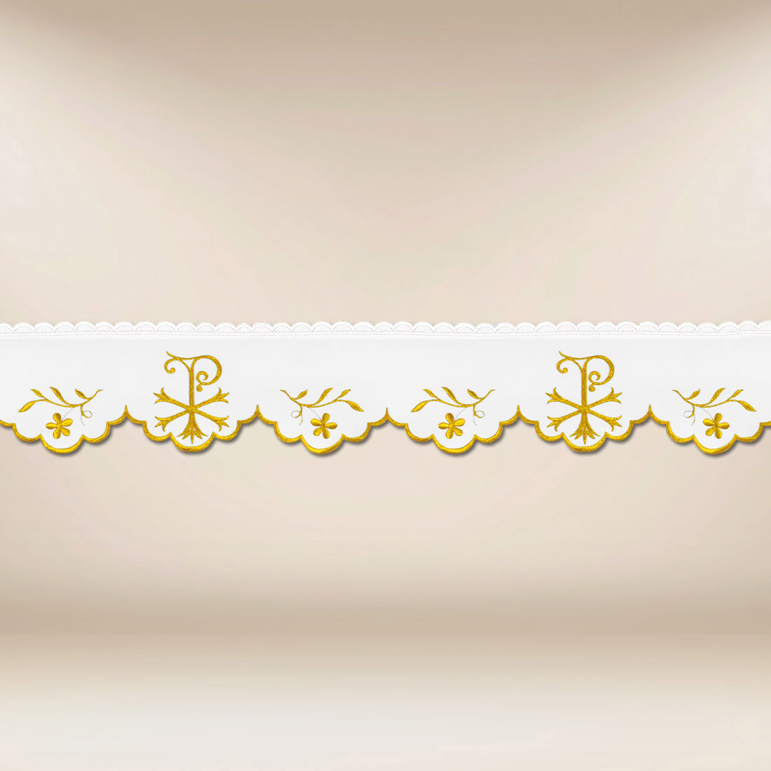 The embroidered lace with delicate gold embroidery is an element that brings subtle elegance, harmony, and a muted glow of tradition to the liturgical space. Its precise ornamentation has been designed to highlight the beauty of the altar and liturgical vestments, complementing them without overshadowing, but rather harmonizing with the whole. This product is refined in every detail, created through years of experience and a passion for craftsmanship that remains consistently artistic in our workshop.