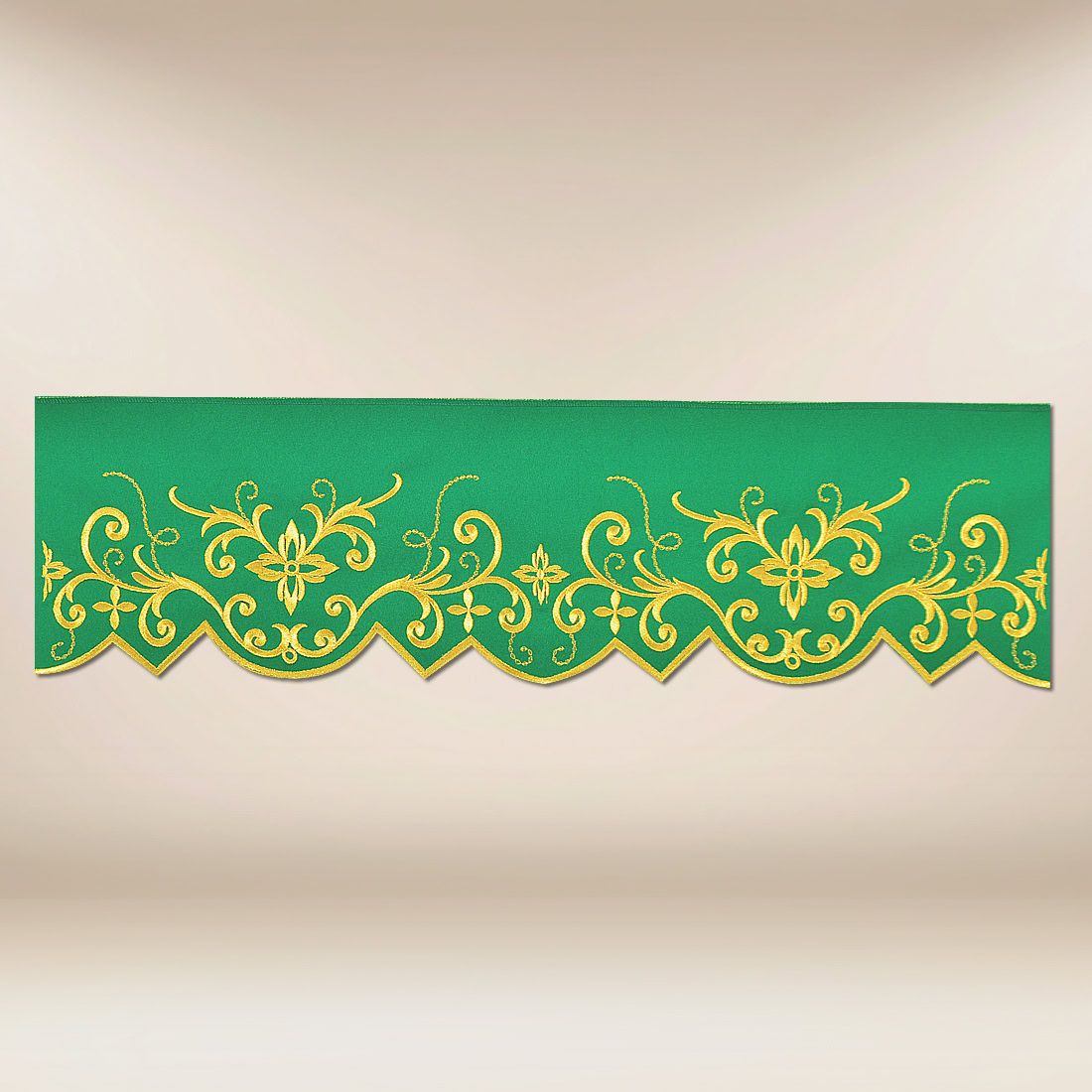 Embroidered lace in green, 290 cm. The ornament, with a height of 15 cm, is subtle yet elegant, bringing order, harmony, and a solemn character to the presbytery. The decorative line of the embroidery complements the altar arrangement, organizing the space without overwhelming it.