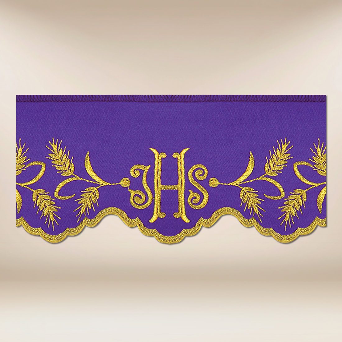 Embroidered sacred lace in violet, 590 cm. The motif of IHS surrounded by ears of wheat refers to the Eucharistic symbolism of bread and introduces a cohesive, elevated character to the presbytery. The embroidery ornament is subtle yet distinct, serving a decorative function without overshadowing the arrangement.