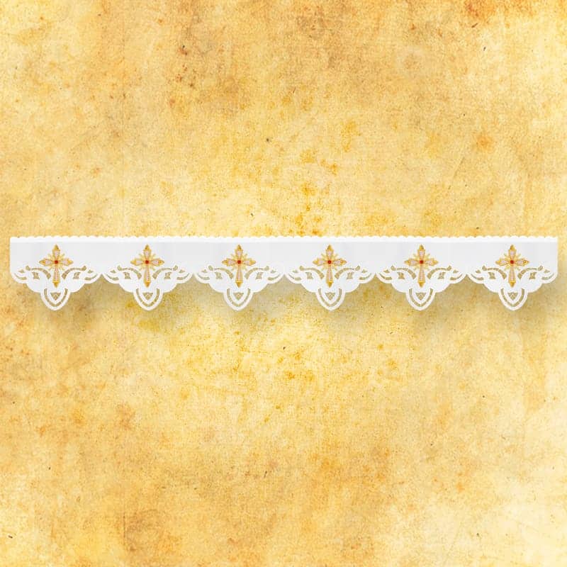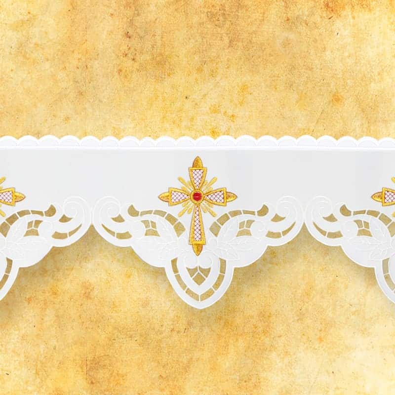 Another example of a unique product is the embroidered lace from the Rafael set. The modern pattern of the richly decorated lace is an excellent choice for sacred decorations. The embroidered liturgical lace Rafael forms an integral whole with the other items in the set. Embroidery height 20 cm