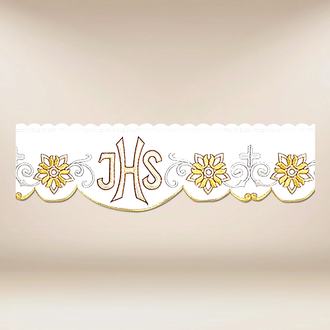 Embroidered altar lace “San Marino” is a high-quality liturgical decoration that imparts exceptional elegance to the altar cloth. Embroidered monograms IHS – a sign of reverence for the Name of Jesus – introduces spiritual depth and subtle beauty, ideal for churches that care for the aesthetics of the liturgy. With the use of precise ornaments and careful embroidery layout, the lace harmoniously complements the altar cloth, creating a cohesive, neat, and festive effect.