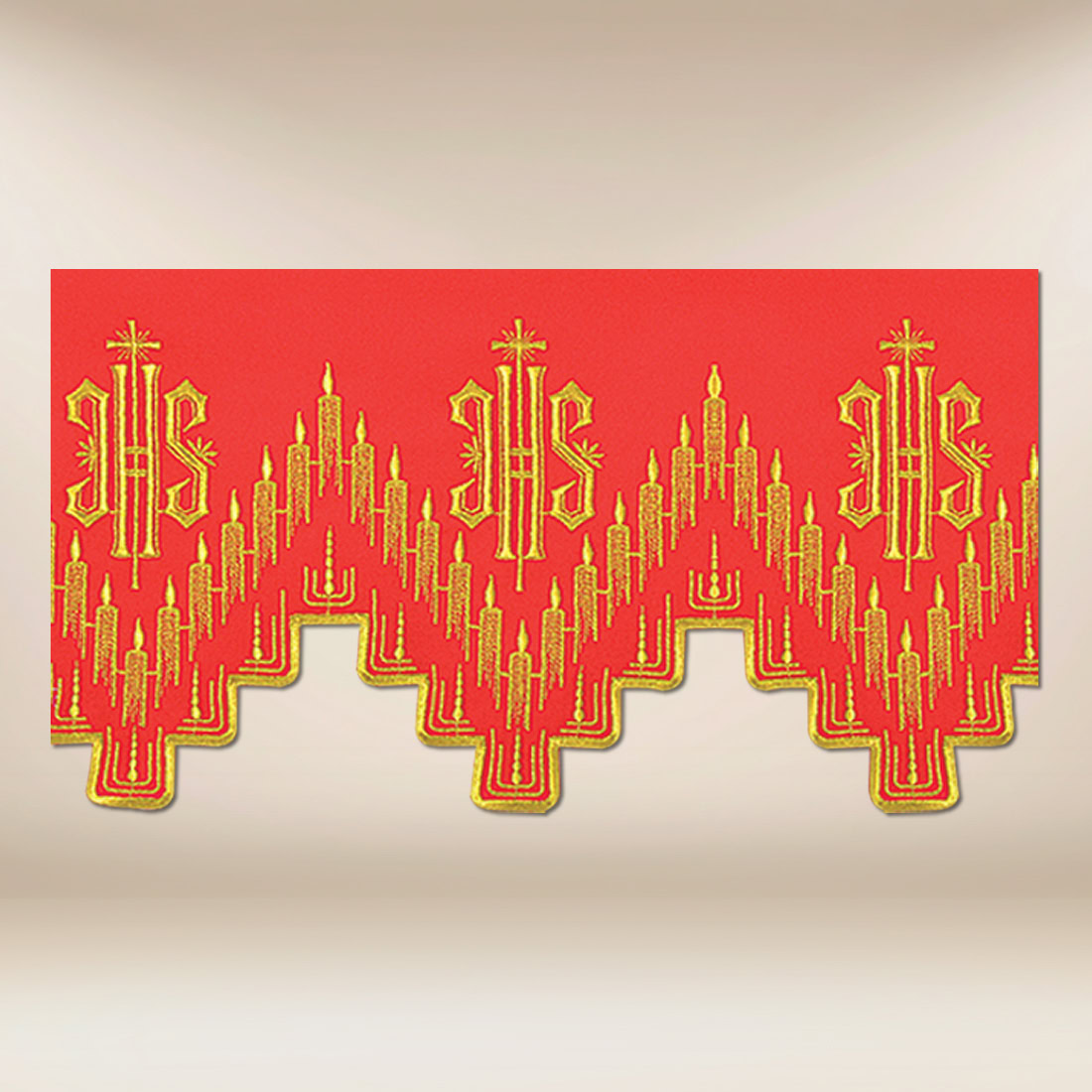 Embroidered lace in red, 290 cm is an elegant and striking finish for a church altar cloth, beautifully highlighting the liturgical character of the presbytery. The monogram motif IHS, applied in a regular spatial rhythm, refers to the Eucharistic presence of Christ. The pattern flows softly, and the ornamental lines create a composition that organizes the space and imparts a sacred dimension.