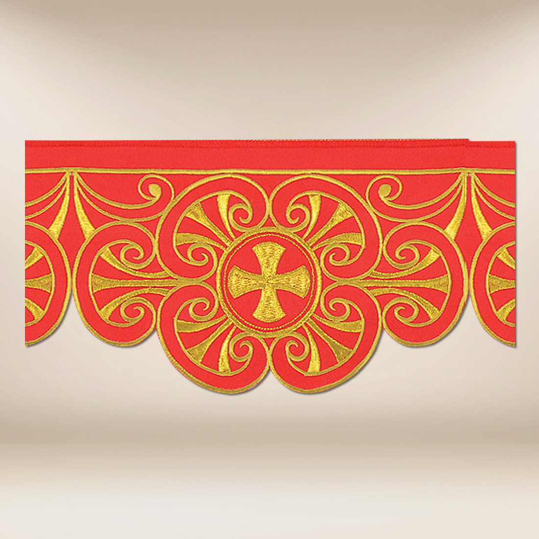 Embroidered liturgical lace in red, 590 cm. The central motif of the cross, surrounded by an intricate embroidery pattern, imparts to the lace a character of symbolic decoration while maintaining appropriate harmony and liturgical restraint.