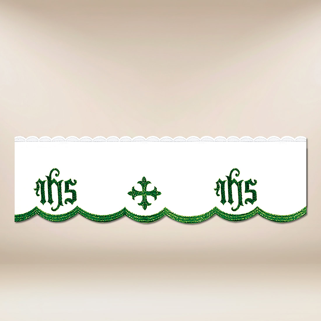 The elegant embroidered liturgical lace “Cathedral” in green is an aesthetic decorative element for finishing altar linens.