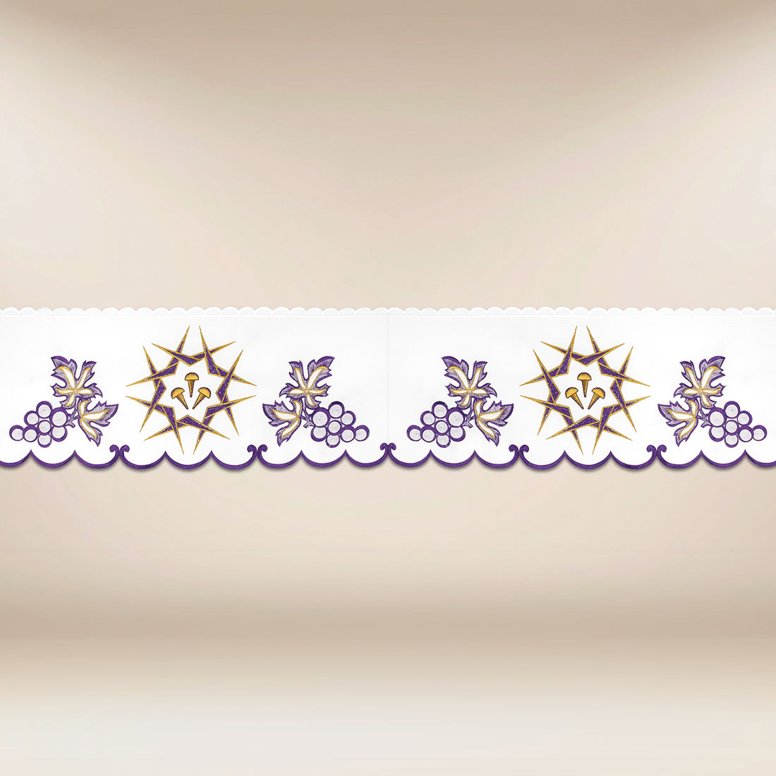 Lenten embroidered lace “Passion” has been designed with the solemnity of Eucharistic celebrations in mind. The central element of the pattern is a cross surrounded by a crown of thorns, evoking the mystery of Christ’s Passion and redemptive sacrifice. This motif, rendered in harmonious shades of purple and gold, emphasizes the liturgical gravity and sacred nature of seasons such as Lent, the Paschal Triduum, and adoration of the Blessed Sacrament.