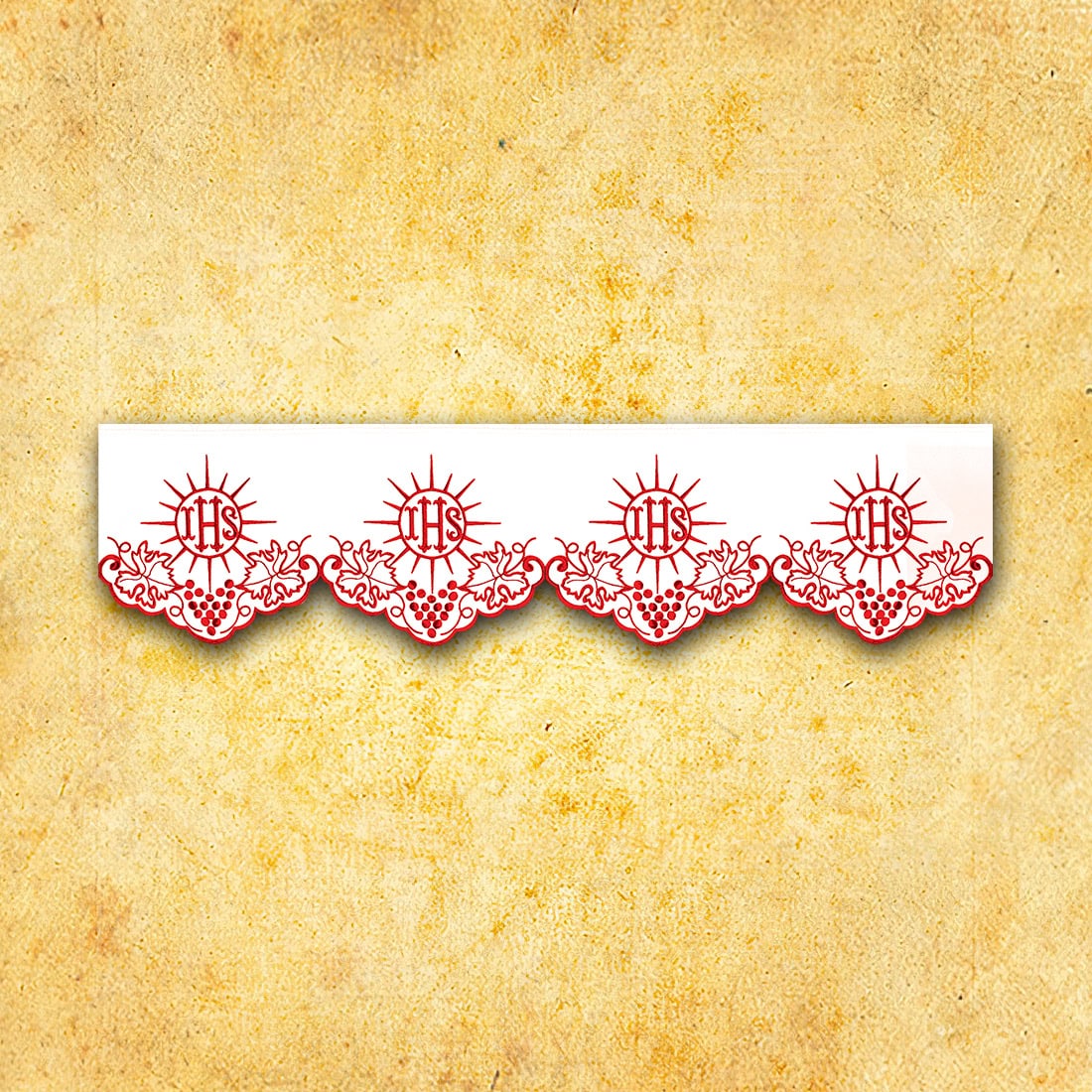 Another example of a unique product is the embroidered lace from the Cristiano set. The modern pattern of richly decorated lace is an excellent choice for sacred decorations. The Cristiano embroidered liturgical lace forms an integral whole with the other items in the set. Embroidery height 23 cm