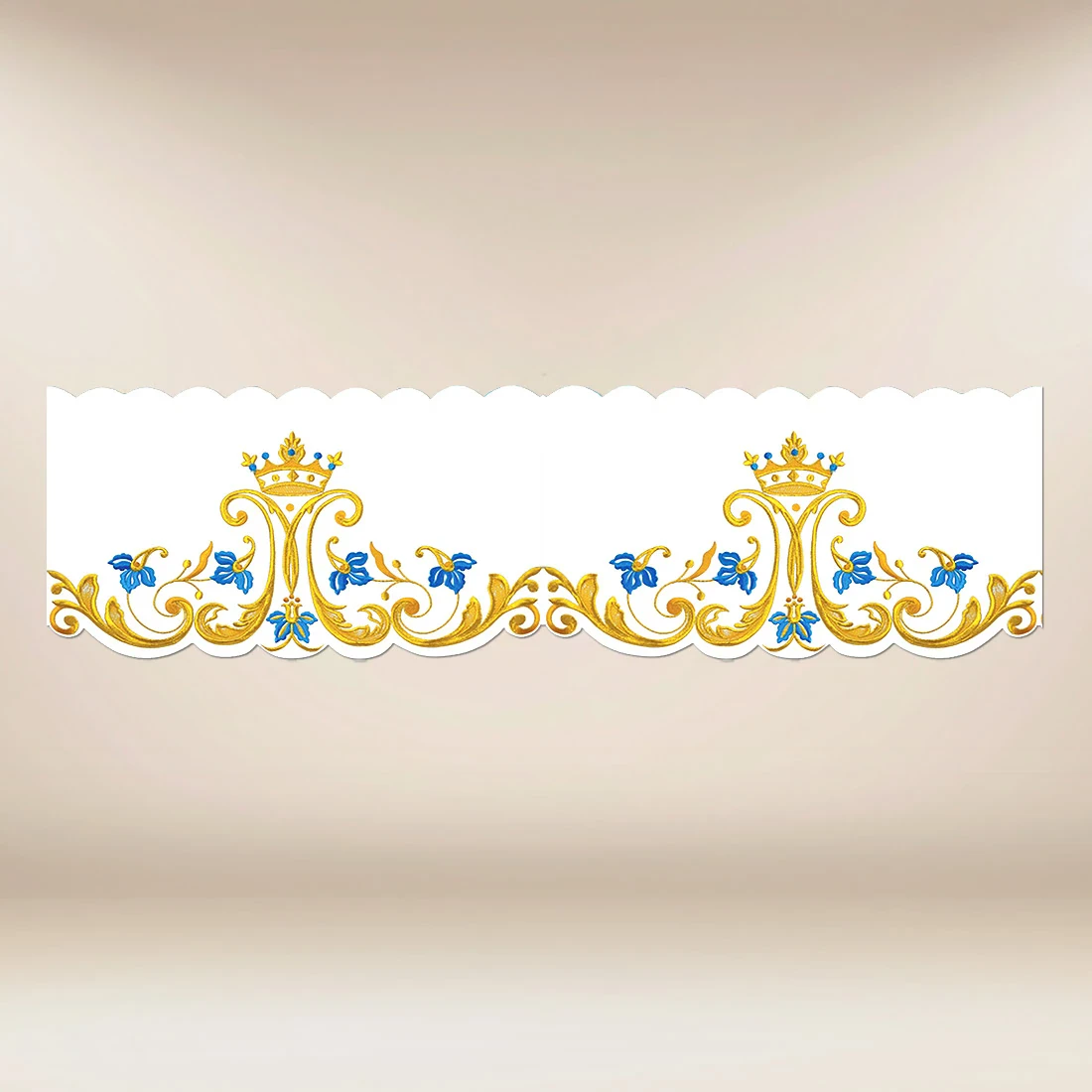 Marian Lace with gold-blue embroidery is perfect as a finishing touch for altar linens or a decorative element in a chapel. Its classic design and elegant color scheme make it suitable for various liturgical arrangements, emphasizing the solemn character of the celebrations.