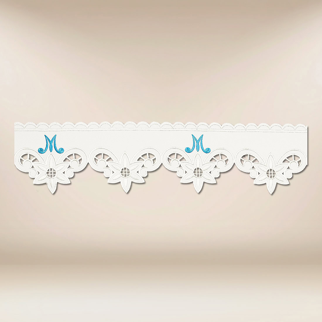 Marian Lace with blue embroidery measuring 12cm is suitable as an embellishment for altar linens or a decorative element in a chapel, adding lightness and a solemn character to compositions. Its universal design and elegant color scheme make it a perfect match for both traditional and modern liturgical arrangements.