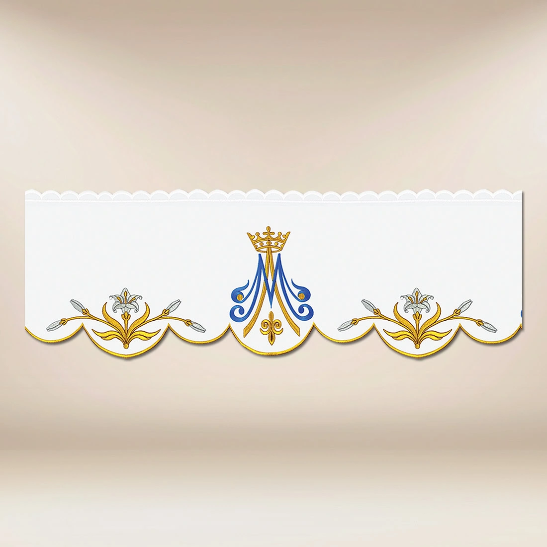 Embroidered Marian Lace “Marian Royal” is an exceptional offering for places where liturgy and aesthetics go hand in hand with tradition. The vivid Marian monogram, crowned, builds a depth of symbolism: it honors the Mother of God as Queen. The surrounding floral embroidery ornaments emphasize the subtlety of the composition, making this lace particularly suitable for temples that wish to impart uniqueness and a solemn tone to their presbytery.