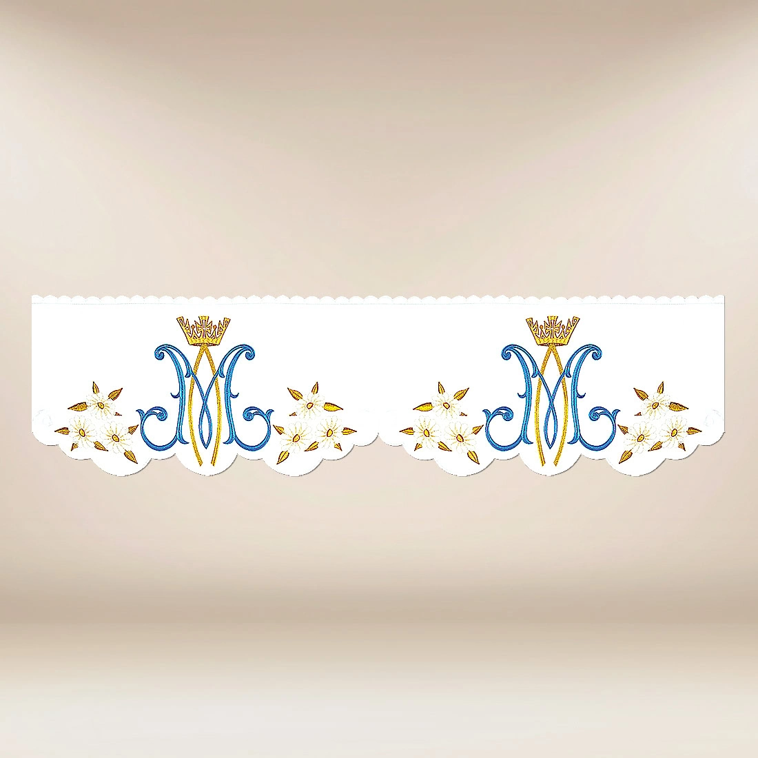 Embroidered Marian Lace “Mater Dei” is a precisely crafted decorative element that, due to its symbolism and elegance, perfectly emphasizes the sacred character of the liturgical space. The vivid Marian monogram, surrounded by stylized plant motifs, creates a composition of deep religious significance. The embroidery height is 26 cm, making it clear and proportional, thus giving the altar a harmonious, solemn tone.