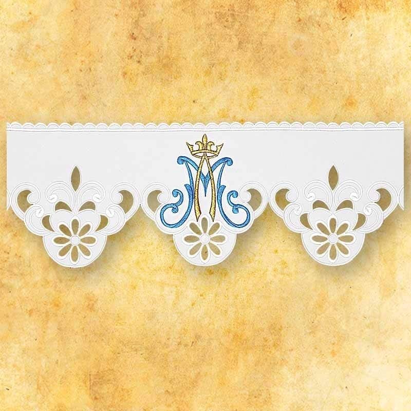 Marian embroidered lace made of high-quality 100% polyester fabric. Stain-resistant and durable material, perfect for liturgical decorations. The 21 cm high embroidery emphasizes the elegance and aesthetics of the finish.