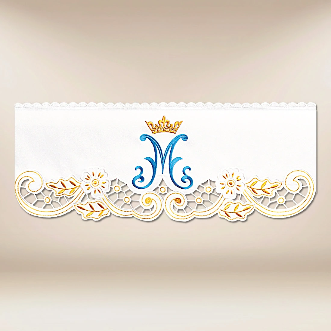 Marian Lace with gold and blue embroidery measuring 23cm is suitable as an embellishment for altar linens or a decorative element in a chapel, adding lightness and a solemn character to compositions. Its universal design and elegant color scheme make it a perfect match for both traditional and modern liturgical arrangements.