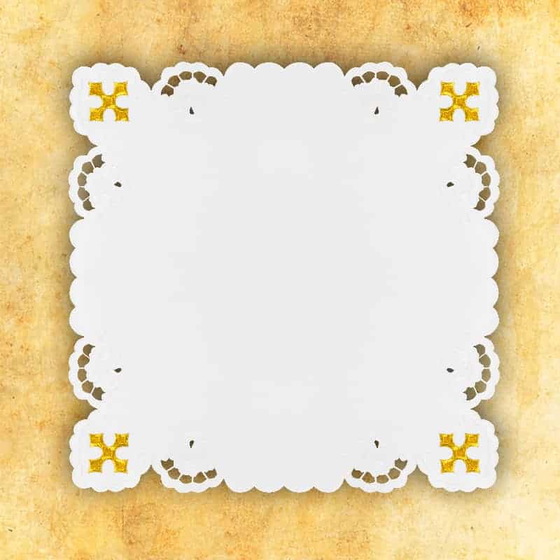 The unique embroidered liturgical napkin from the Affilato set is an example of an original, modern form and perfect workmanship of an embroidered napkin. The liturgical embroidered napkin from the Affilato set, measuring 45×45 cm, perfectly matches the other elements of the set with its embroidered motif.