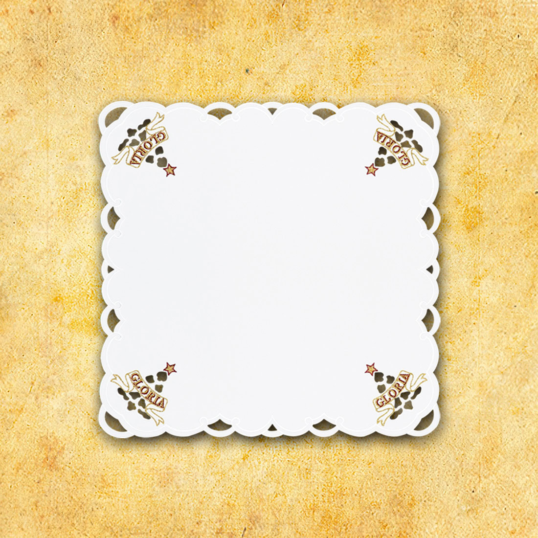 Embroidered tablecloth from the “Gloria” set. Fabric: Stain-resistant 100% polyester Dimensions: 45cmx45cm Color: white We also offer embroidered items: – tablecloths (by the meter) – lace-napkins (33×32; 45×45)-lecterns-chalice linens-tablecloths embroidered on the sides-dresses for cans-tablecloths (95×95; 110×110)