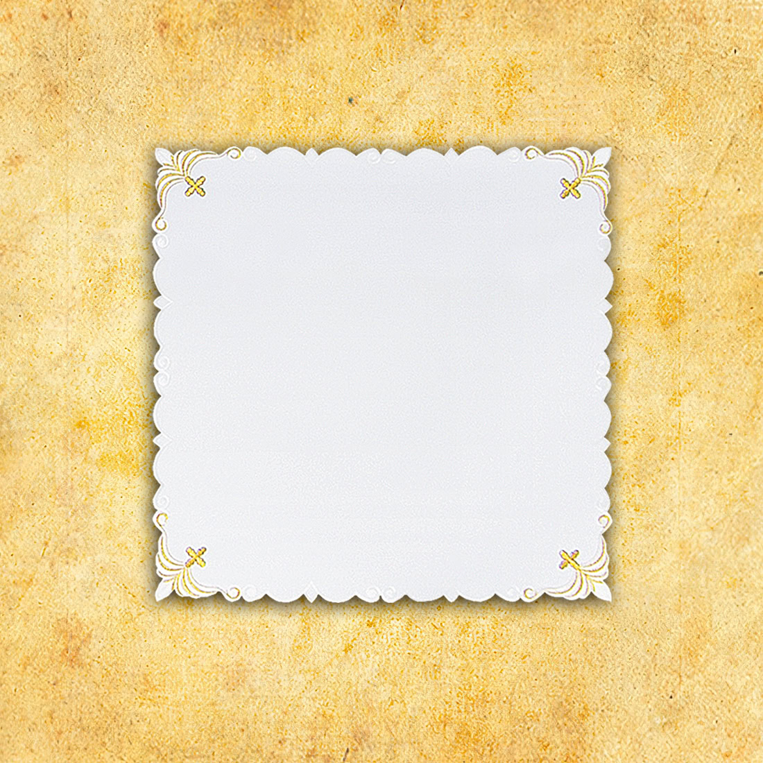 Liturgical altar cover 45 cm × 45 cm made of high-quality white polyester fabric (100%).Smooth, stain-resistant, and easy to care for, it retains its elegant appearance for many years. Decorated with delicate embroidery, it emphasizes the sacred character and elegance of the interior. Ideal for churches and chapels – perfect for Masses, services, and liturgical celebrations.