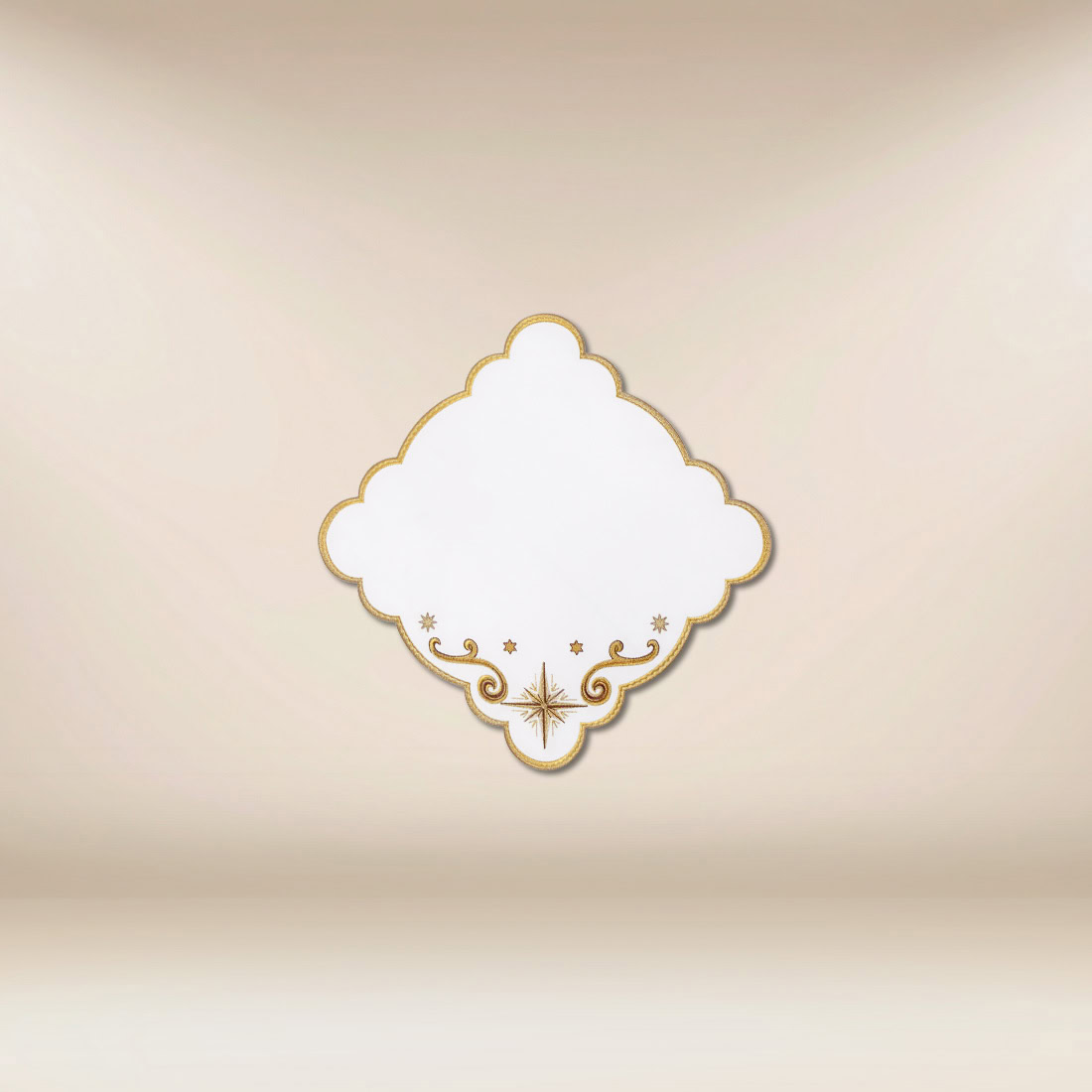 The embroidered Christmas napkin “Sacro Natale” 32×32 has been designed as a unique addition to the liturgical arrangement of the altar. Its elegant shape, composed of delicately profiled edges, creates a harmonious and classic line that blends perfectly with the interior design of the temple. The decorative embroidery at the bottom — subtle, placed on white fabric — gives the napkin a solemn expression and is a beautiful reference to sacred design.