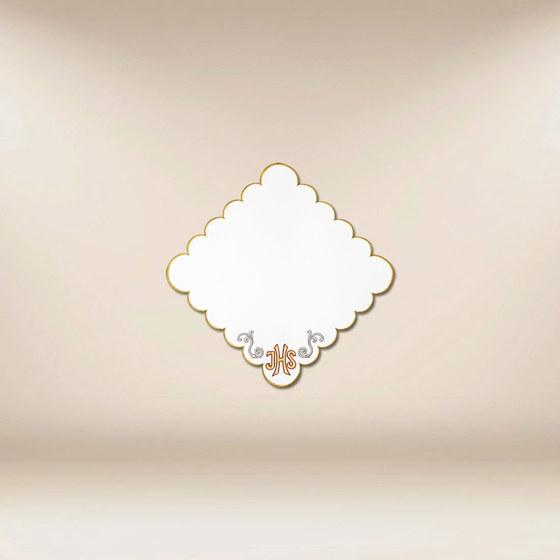 Liturgical embroidered napkin “San Marino” 32×32 has been designed with the intention of providing an elegant and dignified setting for Eucharistic celebrations. Its distinctive shape and precisely crafted embroidery in a golden hue highlight the sacred dimension of the liturgy. The ornaments adorning the central motif lend the napkin lightness and harmony, creating a composition beautiful in its simplicity. This liturgical embroidered napkin presents beautifully during both daily Holy Masses and solemn services.