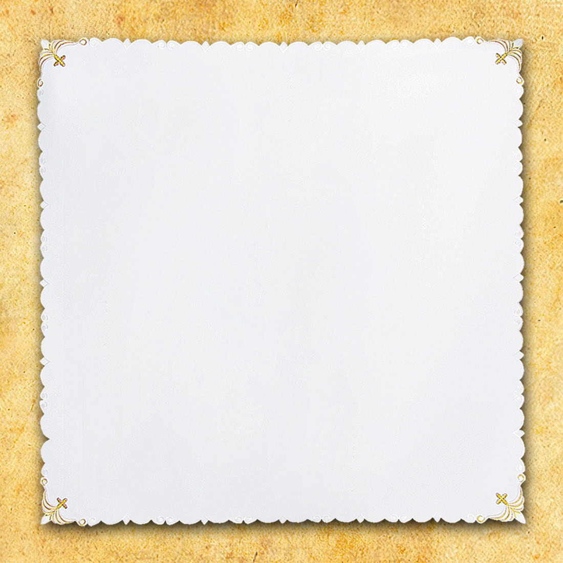 Liturgical napkin 95cm x 95cm made of high-quality white polyester fabric, smooth and stain-resistant.Decorated with delicate gold embroidery, it combines elegance with durability, emphasizing the solemn character of Masses and services.Ideal for churches and chapels as a practical and aesthetic element of altar furnishings.