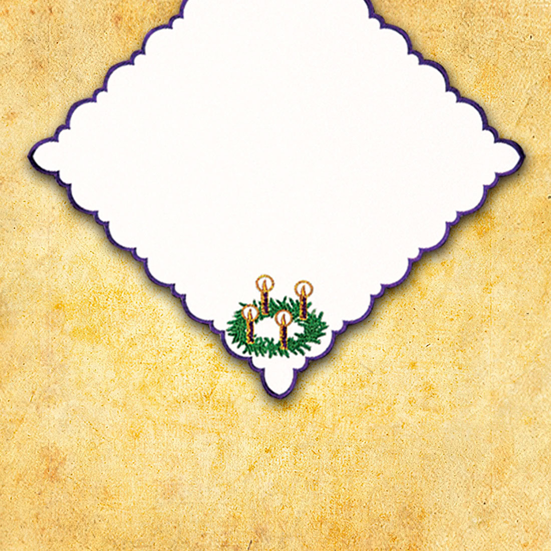 Embroidered napkin “Advent with a wreath”. Fabric: stain-resistant 100% polyester. Color: white. Washing: Recommended washing in an automatic washing machine at 40°C. Color powder, without fabric softeners.nWe also offer embroidered items:-tablecloths (by the meter)-lace-napkins (;45×45;)-lecterns-chalice linens-tablecloths (110×110;95×95)