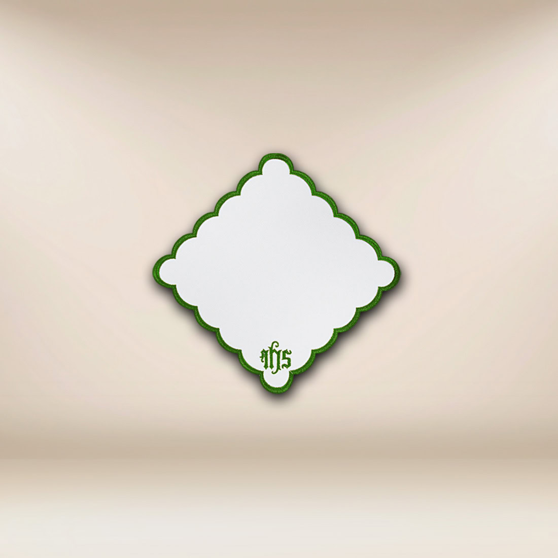 Embroidered Napkin “Cathedral” Green 32×32 is designed as a classic liturgical napkin in a small format, ideal for precise and aesthetic altar decoration. Its compact size allows for versatile use — both as a standalone decorative accent and as a complement to larger altar textiles.