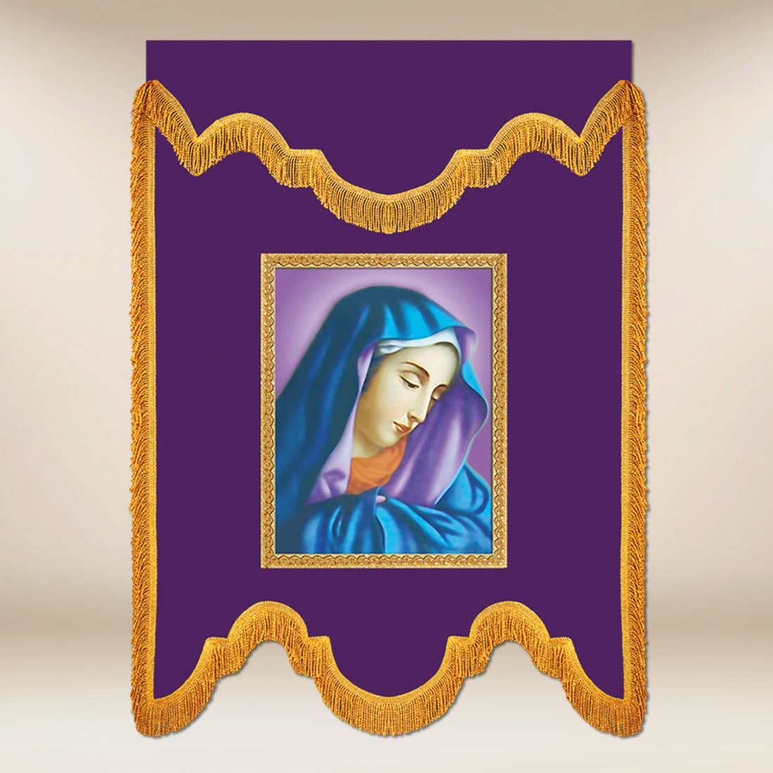 The central motif of the banner is the image of Christ in a crown of thorns, symbolizing His love unto the end and sacrifice for the salvation of mankind. In an alternative version, the banner features a delicate image of the Blessed Virgin Mary, expressing co-suffering and presence at the cross, which further deepens the spiritual experience of prayer. Purple, as a liturgical color, reminds us of penance, waiting, and preparing the heart for the mystery of salvation, while the golden finishes and trimmings emphasize the solemn and ceremonial character of the banner.