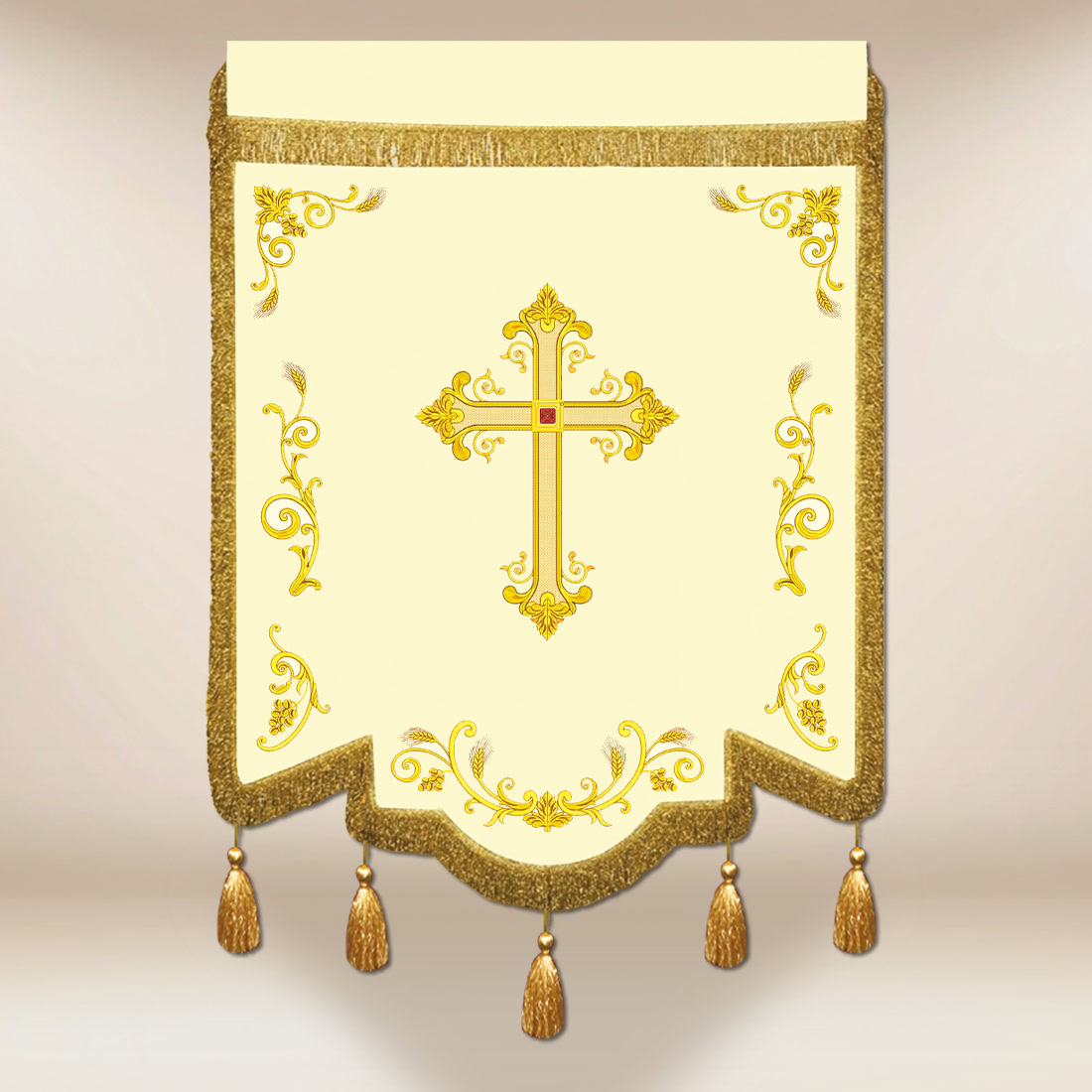 The rich yet balanced ornamentation and decorative finish of the lower edge give the whole a solemn character while maintaining liturgical gravity. The banner fits perfectly into the celebrations of patronal feasts, indulgences, Eucharistic processions, and events related to Franciscan spirituality.