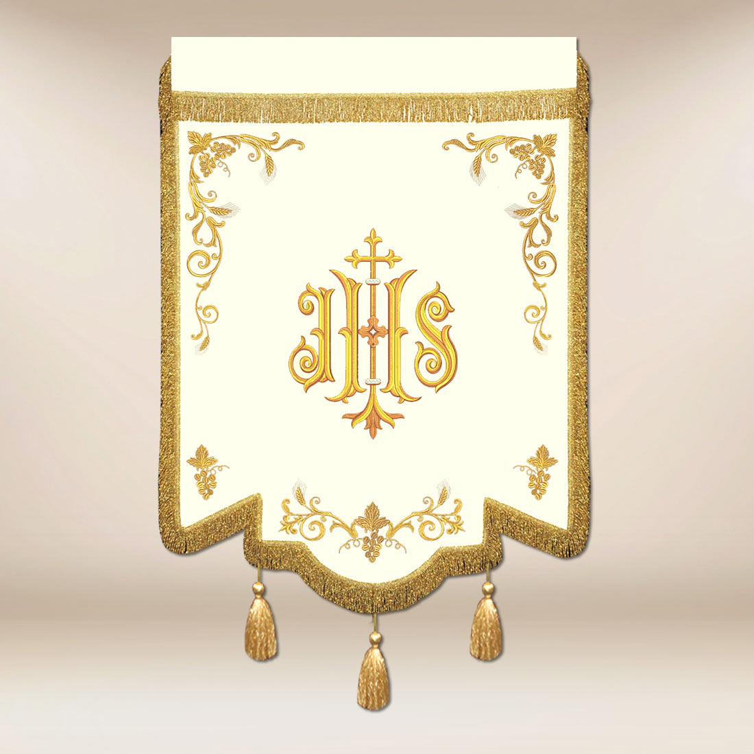 The entire piece has been carefully finished with golden fringes and attached tassels, giving the banner a noble, liturgical character. Solid stitching, precise finishes, and attention to detail guarantee durability for many years of use — both during processions and in the daily life of the parish.